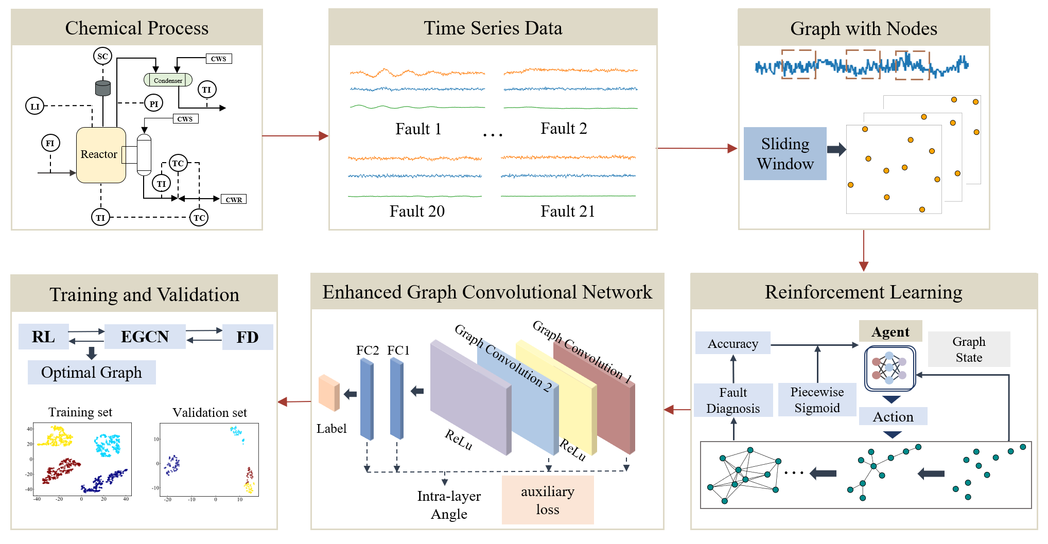 该论文针对化工过程数据中复杂的多变量耦合关系与噪声干扰问题,提出了一种基于图强化学习的自适应图构建与增强图卷积网络(Enhanced Graph Convolutional Network, EGCN)相结合的故障诊断框架(GDDQN-EGCN)。该方法通过强化学习动态优化故障图的连接策略,实现节点距离自适应的图结构生成;同时在图卷积网络中引入角度正则化机制,提升权重多样性与模型泛化能力,从而在噪声干扰下仍能准确提取关键故障特征。研究首次将图强化学习引入化工过程故障诊断,实现了图结构自适应构建与特征提取过程的协同优化,显著提高了模型的诊断精度与鲁棒性,为复杂工业系统的智能化诊断提供了新的解决思路。