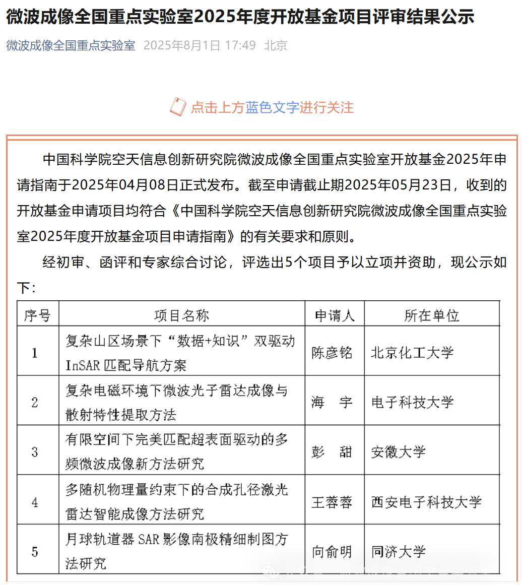 8月1日,中国科学院空天信息创新研究院微波成像全国重点实验室公布了2025年度开放基金项目评审结果。经初审、函评和专家综合讨论后评选出5个项目予以立项并资助。其中,北京化工大学信息科学与技术学院2022级博士研究生陈彦铭(指导教师:张帆教授)成功入选,也是本年度唯一入选的在读博士生。该基金于近日完成项目立项,资助额度8万元。