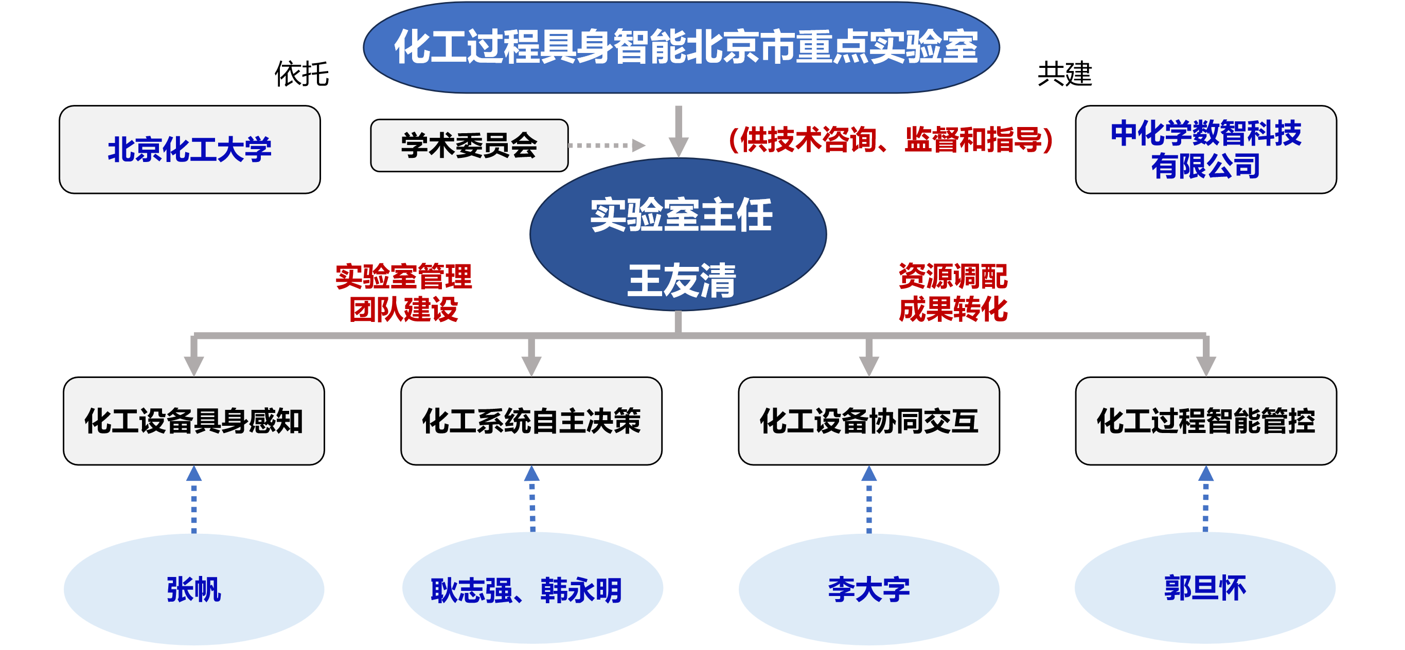 “化工过程具身智能北京市重点实验室”由北京化工大学申报,以北京化工大学信息科学与技术学院为依托研究机构,中化学数智科技有限公司作为共建单位,北京化工大学信息科学与技术学院院长、国家自然科学基金杰出青年项目获得者、IET Fellow、中国自动化学会会士王友清教授担任实验室主任。实验室主要聚焦于将具身智能理论深度融入化工场景,突破传统工业化智能系统的局限,形成环境嵌入、自主进化的化工智能新范式。主要研究方向有:1)化工设备具身感知,建立化工环境实时感知理论体系;2)化工系统自主决策,实现从自动化到自主化的范式跃迁;3)化工设备协同交互,推动人-机-环的深度协同交互;4)化工过程智能防控,构建全生命周期风险管控架构。