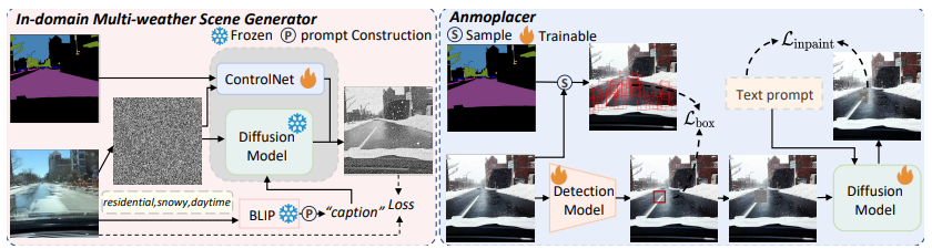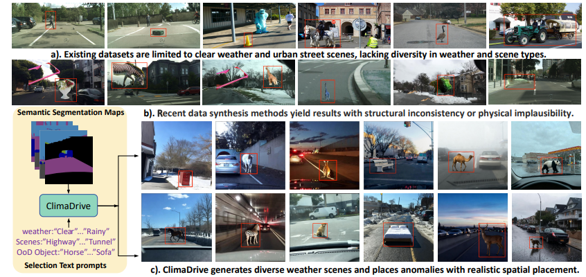 该论文聚焦开放世界自动驾驶场景中的异常分割(Open-world Anomaly Segmentation)问题。针对当前异常样本稀缺、真实数据天气与场景分布单一,以及现有合成方法在空间布局与物理一致性方面存在显著缺陷等核心挑战,作者提出了一种语义约束驱动的图像到图像生成框架 ClimaDrive。该框架通过引入语义地图与结构引导机制,实现跨天气条件的可控异常注入,在保证空间合理性与物理一致性的前提下生成高质量训练数据。