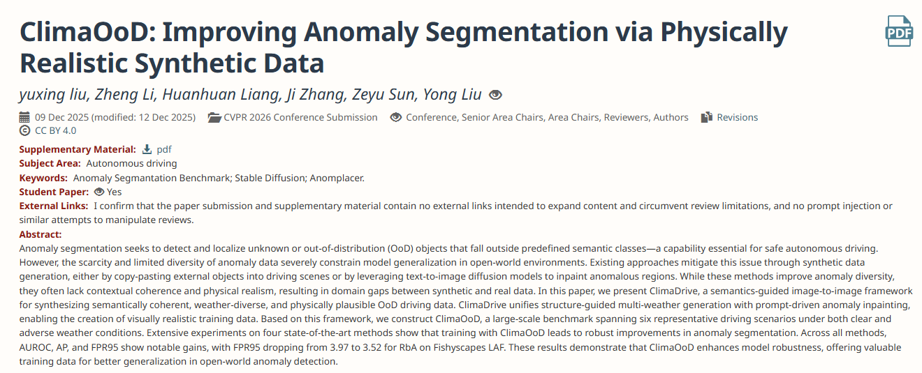 2月21日,国际计算机视觉与模式识别会议(IEEE/CVF Conference on Computer Vision and Pattern Recognition, CVPR 2026)录用结果正式公布。李征教授团队的研究论文《ClimaOoD: Improving Anomaly Segmentation via Physically Realistic Synthetic Data》被成功录用。CVPR是计算机视觉领域最具影响力的国际顶级会议之一,2026年CVPR共收到16,092篇有效投稿,最终推荐录用4,090篇论文,整体录用率为25.42%。