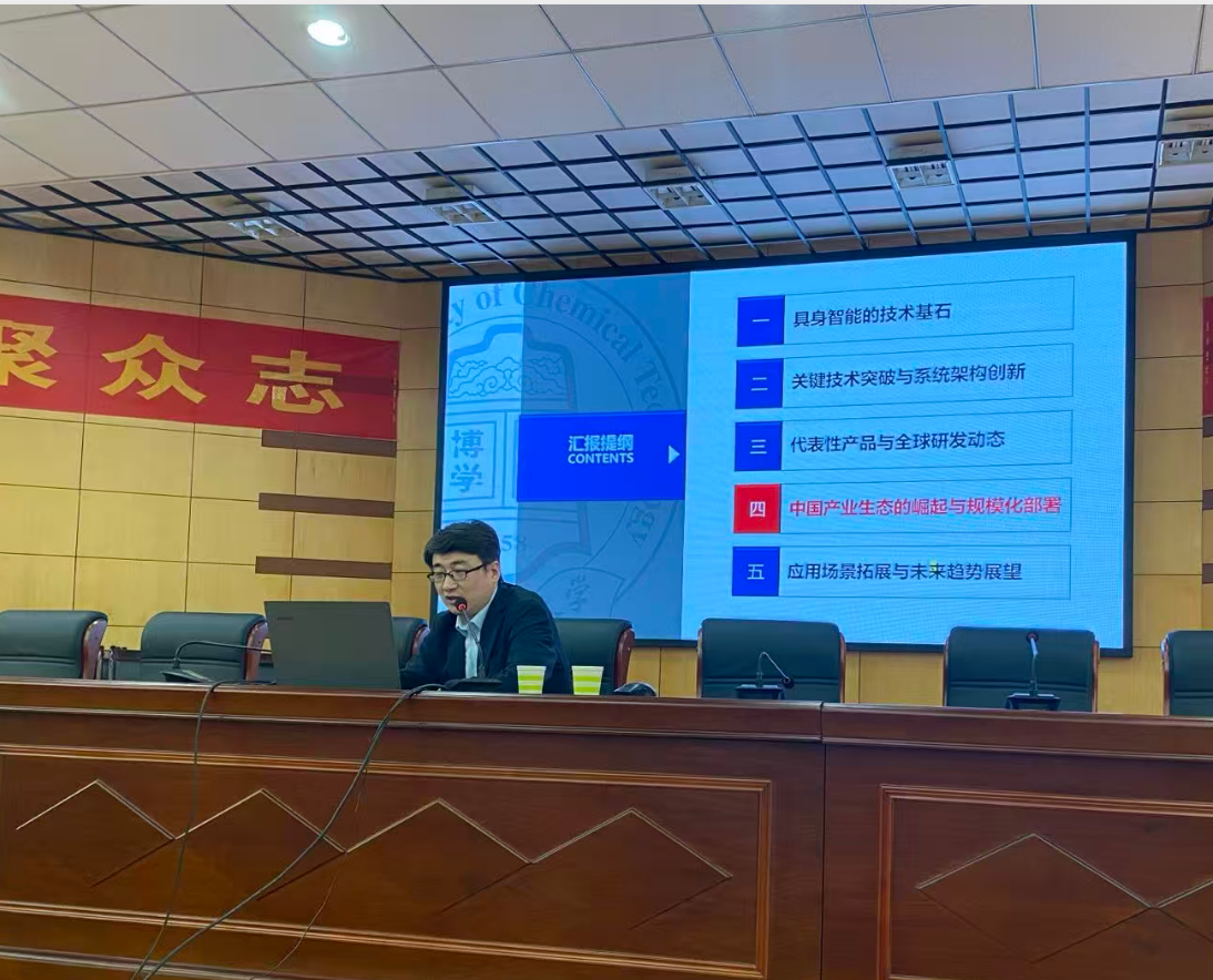 “机器人也能像人一样感知世界吗?”王友清院长以《具身智能的前沿进展与机器人技术演进》为题作科普讲座。从春晚舞台上的智能交互到正在建设中的“化工过程具身智能”北京市重点实验室,展示了人工智能技术的跨越式发展,阐述了智能体通过“身体”与环境交互实现感知、学习与决策的基本原理,同时也展现了人工智能技术与学校传统优势学科深度融合的广阔前景。王院长用通俗易懂的比喻和有趣的视频,将高深的“具身智能”讲得妙趣横生,现场气氛热烈。